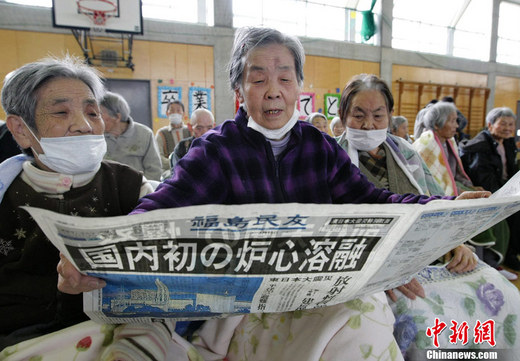 資料圖: 北京時(shí)間3月11日13點(diǎn)46分,日本本州島附近海域發(fā)生里氏9.0級(jí)地震,震中位于宮城縣以東太平洋海域,此次地震海嘯造成至少1萬(wàn)人下落不明,并引發(fā)了福島縣核電站爆炸。圖為13日,福島縣爆炸的核電站附近居住的居民被轉(zhuǎn)移到安全地帶后,幾位老人在看報(bào)紙。