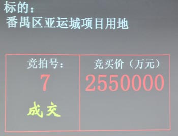 在短暫的靜默與期待之后,富力聯(lián)合體繼續(xù)叫價,一舉打破了業(yè)內(nèi)心理關(guān)口,并引發(fā)全場鼓掌。在富力聯(lián)合體將地價叫到255億元的時候,保利聯(lián)合體不再繼續(xù)叫價。“255億元第一次……255億元第二次……255億元第三次,成交!”伴隨著一聲響亮的棰聲,亞運城項目在歷時半個鐘頭經(jīng)過47輪叫價之后被富力聯(lián)合體競得。
