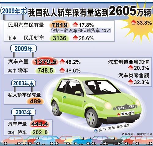 《中華人民共和國2009年國民經(jīng)濟(jì)和社會(huì)發(fā)展統(tǒng)計(jì)公報(bào)》顯示,2009年末,全國民用汽車保有量達(dá)到7619萬輛(包括三輪汽車和低速貨車1331萬輛),比上年末增長17.8%,其中民用轎車保有量3136萬輛,增長28.6%。