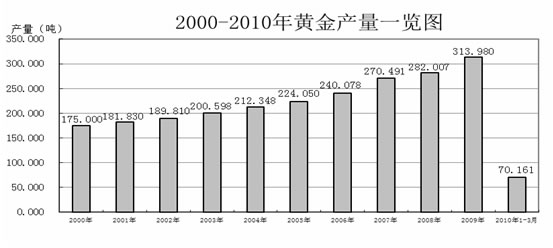2010年1-3月,全國(guó)累計(jì)產(chǎn)金70.161噸,與去年同期相比,黃金產(chǎn)量增加2.960噸,同比增長(zhǎng)4.40%。其中礦產(chǎn)金完成57.295噸,同比增長(zhǎng)6.03%。有色副產(chǎn)金完成12.866噸,同比增長(zhǎng)-2.26%。