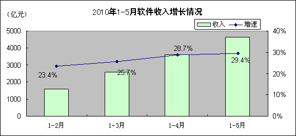 1-5月,軟件產(chǎn)業(yè)累計完成軟件業(yè)務(wù)收入4652億元,同比增長29.4%,增速比去年同期提高6.1個百分點。其中5月份完成軟件業(yè)務(wù)收入1026億元,同比增長32%,比去年增速高10個百分點。