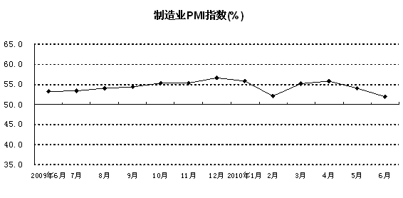 2010年6月,中國(guó)制造業(yè)采購(gòu)經(jīng)理指數(shù)(PMI)為52.1%,低于上月1.8個(gè)百分點(diǎn),該指數(shù)已連續(xù)兩個(gè)月出現(xiàn)回落,但仍位于臨界點(diǎn)——50%以上。表明制造業(yè)經(jīng)濟(jì)總體繼續(xù)保持增長(zhǎng)態(tài)勢(shì),但在國(guó)家近期出臺(tái)的宏觀經(jīng)濟(jì)政策以及世界經(jīng)濟(jì)復(fù)蘇步伐放慢等因素作用下,增速趨緩。