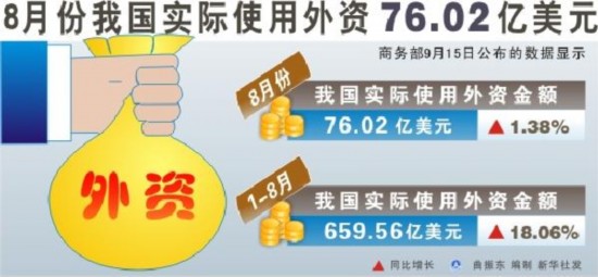 新華網(wǎng)北京9月15日電(記者王希)商務(wù)部15日公布的數(shù)據(jù)顯示,8月份全國(guó)實(shí)際使用外資76.02億美元,同比增長(zhǎng)1.38%。前8個(gè)月,我國(guó)累計(jì)吸收外資659.56億美元,同比增長(zhǎng)18.06%。