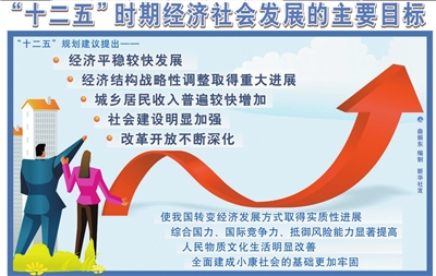 《建議》提出,綜合考慮未來發(fā)展趨勢和條件,今后五年經(jīng)濟社會發(fā)展的主要目標是:經(jīng)濟平穩(wěn)較快發(fā)展,經(jīng)濟結(jié)構(gòu)戰(zhàn)略性調(diào)整取得重大進展,城鄉(xiāng)居民收入普遍較快增加,社會建設(shè)明顯加強,改革開放不斷深化。經(jīng)過全國人民共同努力奮斗,要使我國轉(zhuǎn)變經(jīng)濟發(fā)展方式取得實質(zhì)性進展,綜合國力、國際競爭力、抵御風險能力顯著提高,人民物質(zhì)文化生活明顯改善,全面建成小康社會的基礎(chǔ)更加牢固。