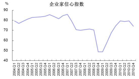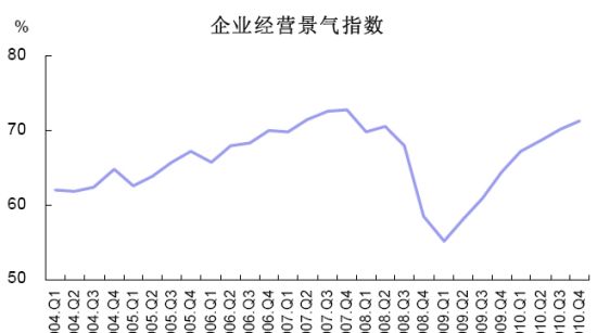 2010年第4季度,中國人民銀行在全國進(jìn)行了企業(yè)家問卷調(diào)查,調(diào)查結(jié)果顯示:企業(yè)家信心高位回落;企業(yè)經(jīng)營狀況良好,景氣指數(shù)連續(xù)第七個(gè)季度攀升,未來預(yù)期謹(jǐn)慎樂觀;國內(nèi)訂單繼續(xù)上行,出口訂單出現(xiàn)下滑;原材料價(jià)格上升明顯;支付能力創(chuàng)新高;企業(yè)投資意愿轉(zhuǎn)升為降,出現(xiàn)波動(dòng)。