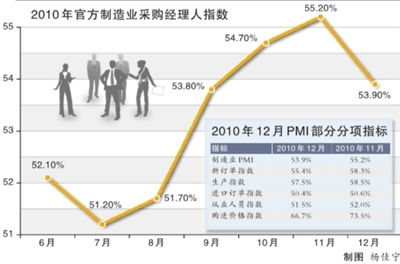 昨天,中國物流與采購聯(lián)合會(huì)公布2010年12月官方制造業(yè)采購經(jīng)理指數(shù)(PMI)為53.9%,較11月回落1.3個(gè)百分點(diǎn),這是該指數(shù)在連續(xù)四個(gè)月上升后首度回落。目前該指數(shù)繼續(xù)保持在較高水平,顯示出當(dāng)前經(jīng)濟(jì)增長態(tài)勢基本平穩(wěn)。值得注意的是,此前一直上漲的購進(jìn)價(jià)格指數(shù)12月出現(xiàn)明顯回落,顯示在政策作用下物價(jià)水平有所回落。