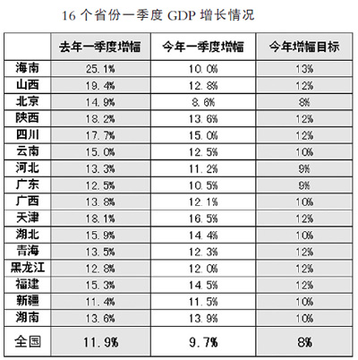 目前,各地一季度經(jīng)濟(jì)運(yùn)行初步核算數(shù)據(jù)陸續(xù)公布。從已公布的16個(gè)省份GDP同比增長(zhǎng)速度看,除湖南和新疆兩地GDP增幅略高于去年同期外,其余14個(gè)省份均低于去年一季度增幅。