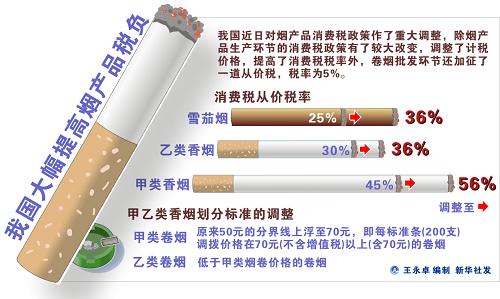 “為了適當(dāng)增加財(cái)政收入,完善煙產(chǎn)品消費(fèi)稅”,近日,經(jīng)國(guó)務(wù)院批準(zhǔn),財(cái)政部、國(guó)家稅務(wù)總局對(duì)煙產(chǎn)品消費(fèi)稅政策作了重大調(diào)整,除煙產(chǎn)品生產(chǎn)環(huán)節(jié)的消費(fèi)稅政策有了較大改變,提高了消費(fèi)稅稅率外,卷煙批發(fā)環(huán)節(jié)還加征了一道從價(jià)稅,新政策從5月1日起執(zhí)行。