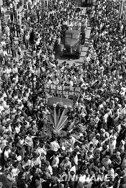 1956年7月15日,長春第一汽車制造廠生產(chǎn)出中國第一輛解放牌汽車,從此結(jié)束了中國不能生產(chǎn)汽車的歷史。這是第一批國產(chǎn)解放牌載重汽車排成長列開出長春第一汽車制造廠的時候,全廠職工夾道歡呼。新華社發(fā)
