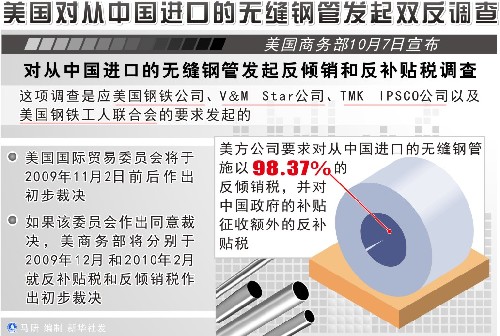 美國對(duì)從中國進(jìn)口的無縫鋼管發(fā)起雙反調(diào)查 新華社圖表,北京,2009年10月8日 圖表