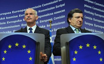 3月17日,在比利時首都布魯塞爾的歐盟總部,歐盟委員會主席巴羅佐(右)與到訪的希臘總理喬治·帕潘德里歐出席記者招待會。新華社記者 武巍 攝