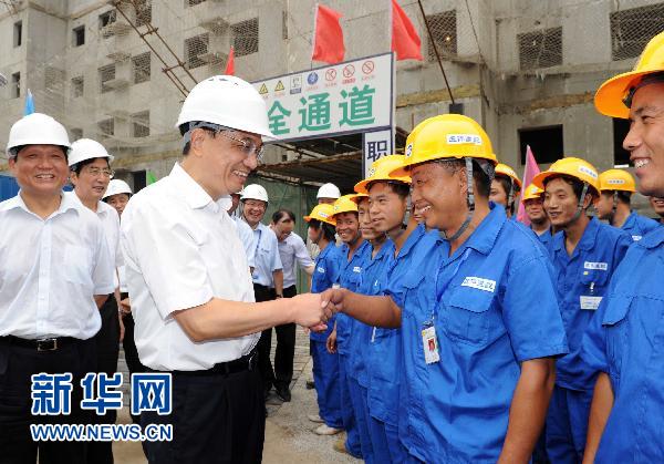 8月13日,中共中央政治局常委、國務院副總理李克強在北京市考察廉租住房、公共租賃住房等建設。這是李克強在管莊考察保障性住房項目建設時,同工程建設者親切交談。 新華社記者 饒愛民 攝