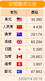 臺幣匯率公告2008.07.04