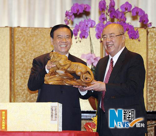 6月9日,中國國民黨榮譽主席吳伯雄(右)在臺北圓山大飯店與浙江省省長呂祖善互贈禮物。當(dāng)日,浙江省長呂祖善率領(lǐng)的千人代表團抵達臺北,開始進行為期一周的訪問。圖片來源:新華網(wǎng)
