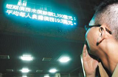 據(jù)報道,7日傍晚近7時,“財政部”財政大樓正門和側(cè)門的電子看板上,以跑馬燈方式秀出“截至2010年11月底,‘中央政府’一年以上債務(wù)未償余額4.32818兆元(新臺幣,下同),短期債務(wù)未償余額2350億元;平均每人負(fù)擔(dān)債務(wù)19.7萬元”,以電子看板的形態(tài)仿效美國設(shè)置“債務(wù)鐘”。