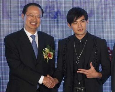 中移動總裁王建宙(左)與周杰倫(右)續(xù)簽動感地帶代言合同