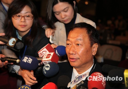 4月6日下午,臺灣鴻海集團(tuán)董事長郭臺銘在出席上海-臺北城市論壇時向記者表示,雙城交流更具務(wù)實意義,他提出上海虹橋機(jī)場與臺北松山機(jī)場趕緊直飛、經(jīng)濟(jì)互相取長、借重上海世博等3點希望。 中新社發(fā) 董會峰 攝