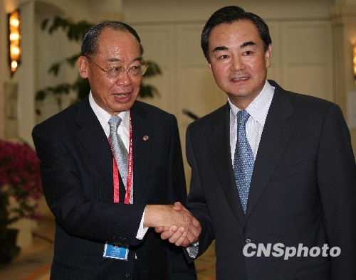 中共中央臺辦、國務(wù)院臺辦主任王毅,10日在海南博鰲為前來出席博鰲亞洲論壇2010年年會的臺灣兩岸共同市場基金會最高顧問錢復(fù)一行舉辦招待酒會。