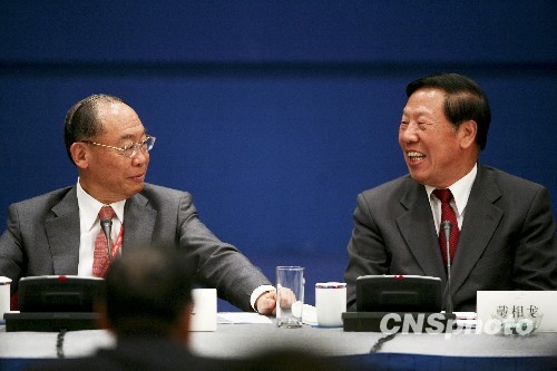 4月11日,博鰲亞洲論壇舉行“兩岸企業(yè)家圓桌會議:兩岸簽訂ECFA后的商機”分論壇。全國社會保障基金理事會理事長戴相龍(右)與兩岸共同市場基金會最高顧問錢復(左)共同主持會議。 中新社發(fā) 陸欣 攝