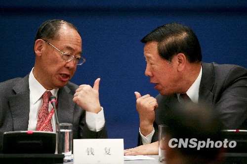 全國社會保障基金理事會理事長戴相龍(右)與兩岸共同市場基金會最高顧問錢復(左)共同主持會議。中新社發(fā) 陸欣 攝