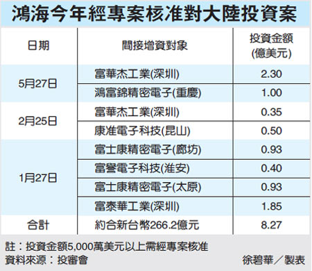 報道說,臺灣首富郭臺銘旗下的鴻海集團今年仍不斷投資大陸,由投審會項目審查核準(zhǔn)的案子已有八件,累計金額8.27億美元,約新臺幣266億元。投審會執(zhí)行秘書范良棟指出,鴻海在大陸據(jù)點超過100個,增資資金來源來自盈余,大陸事業(yè)獲利后,一部分匯回臺灣,一部分再投資。