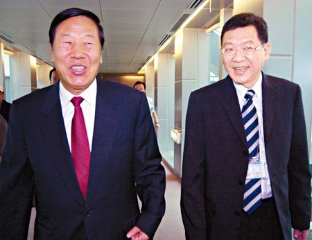 全國社;鹄硎聲硎麻L戴相龍(左)15日來臺,將參加由臺灣旺旺中時(shí)媒體主辦的“2010經(jīng)濟(jì)金融論壇”,臺灣《工商時(shí)報(bào)》社長王嶠奇(右)至桃園國際機(jī)場迎接。圖片來源:臺灣《旺報(bào)》