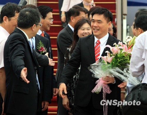 6月14日,臺北市長郝龍斌搭乘臺北松山—上海虹橋首航飛機抵達上海,并表示,90分鐘的直航是歷史性的。 中新社發(fā) 潘索菲 攝