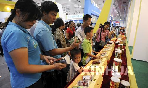 10月24日,在廣西玉林舉行的第七屆中小企業(yè)商機(jī)博覽會臺灣館內(nèi),觀眾選購臺灣特產(chǎn)。新華社發(fā)(李岳青 攝)