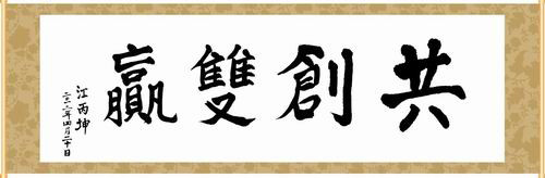 臨行時,江丙坤欣然提筆抒寫“共創(chuàng)雙贏”四字同大家共勉。