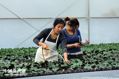 兩岸溫泉產(chǎn)業(yè)合作區(qū)的臺(tái)資展逸蘭花廠棚里,工人們正細(xì)心照料著蘭花幼株。(中國(guó)臺(tái)灣網(wǎng) 楊麗 攝)