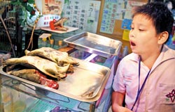 由于相傳鱉肉有滋陰補(bǔ)陽的功效,因此受到不少食客青睞;一位小朋友在鱉肉店前好奇地張望。