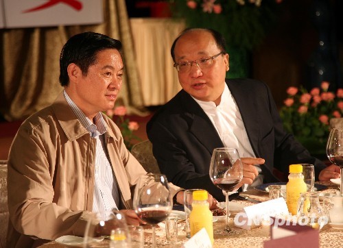 25日晚,臺(tái)中市市長(zhǎng)胡志強(qiáng)會(huì)見并宴請(qǐng)了正在此間參加“天府四川寶島行”的中共四川省委書記劉奇葆一行。胡志強(qiáng)期待大熊貓也能落戶臺(tái)中,目前四川與臺(tái)中還沒有直飛的航線,臺(tái)中方面正在積極努力爭(zhēng)取,希望明年臺(tái)中能直飛四川。圖為劉奇葆與胡志強(qiáng)在宴會(huì)上交談。 中新社發(fā) 鄒輝 攝