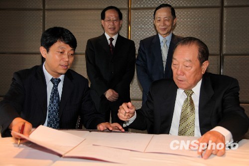 5月20日,在首度訪臺的海峽兩岸農(nóng)業(yè)交流協(xié)會名譽會長危朝安(后排左)和臺灣二十一世紀基金會董事長高育仁見證下,雙方代表簽訂2010年合作備忘錄,將在年內(nèi)合作舉辦“第二屆兩岸鄉(xiāng)村座談”等活動,深化兩岸農(nóng)業(yè)、基層農(nóng)民交流。 中新社發(fā) 董會峰 攝