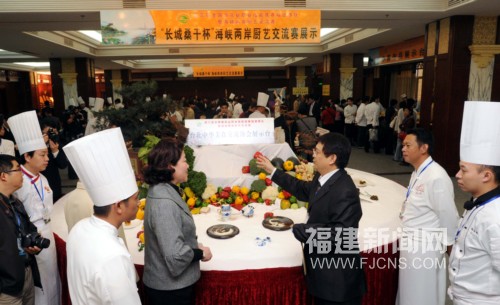 3月18日,臺北中華美食交流協(xié)會執(zhí)行長梁幼祥、馬祖餐飲交流協(xié)會總干事林中超等閩臺烹飪美食業(yè)界嘉賓在此間展出的馬祖餐飲交流協(xié)會展示臺前觀摩交流。