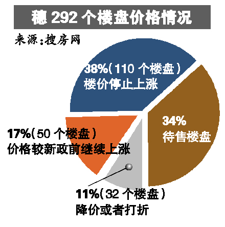 搜房網(wǎng)近日統(tǒng)計了全市292個樓盤,其中有50個樓盤價格較新政前繼續(xù)上漲,占比高達17%;樓價停止上漲的樓盤有110個,占比為38%;只有32個樓盤出現(xiàn)比較明顯的降價或者打折,占比為11%;另外34%為待售樓盤。而二手市場上,一些投資型業(yè)主開始拋售房源,但是降價幅度一般都在5%~10%左右。