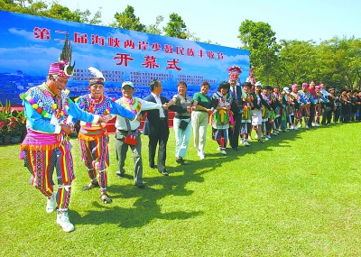 第二屆海峽兩岸少數(shù)民族豐收節(jié)上,兩岸民眾手牽著手,載歌載舞。記者 關(guān)建東 攝