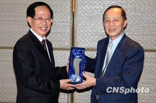 5月20日,海峽兩岸農(nóng)業(yè)交流協(xié)會(huì)與臺(tái)灣二十一世紀(jì)基金會(huì)在臺(tái)北舉行座談會(huì),并簽訂2010年合作備忘錄。圖為二十一世紀(jì)基金會(huì)董事長(zhǎng)、前臺(tái)南縣長(zhǎng)高育仁(右)向首度訪臺(tái)的海峽兩岸農(nóng)業(yè)交流協(xié)會(huì)名譽(yù)會(huì)長(zhǎng)危朝安贈(zèng)送禮品,禮品上刻“研發(fā) 創(chuàng)新 和平”等字樣。 中新社發(fā) 董會(huì)峰 攝