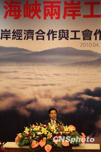 4月10日,以“兩岸經(jīng)濟(jì)合作與工會(huì)作用”為主題的第四屆海峽兩岸工會(huì)論壇在臺(tái)灣高雄舉行,這是該論壇2006年創(chuàng)辦以來(lái)首次在臺(tái)灣舉辦。圖為率大陸代表團(tuán)參加論壇的中華全國(guó)總工會(huì)副主席徐震寰在開幕式上致辭。 中新社發(fā) 羅欽文 攝