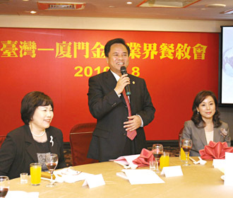 廈門市長劉賜貴(中)率廈門經(jīng)貿(mào)文化交流考察團(tuán),8日與“金管會(huì)副主委”李紀(jì)珠(右)、臺(tái)灣金控董事長張秀蓮(左)等臺(tái)灣金融界人士座談;劉賜貴表示,廈門將建設(shè)兩岸金融合作試驗(yàn)區(qū),打造兩岸區(qū)域性金融服務(wù)中心,提供臺(tái)灣金融界進(jìn)入大陸發(fā)展的良機(jī)。