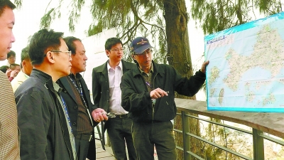 陸資代表考察金門水頭國際港經(jīng)貿(mào)園區(qū),聽取港區(qū)規(guī)劃建設(shè)介紹。