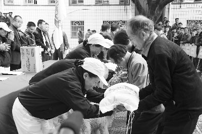 每發(fā)放一件物資,志工們都深深鞠躬并送上祝福。