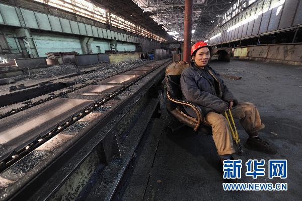 首鋼高速線材廠二車間的剪尾工肖銀奎在剪完最后一根鋼筋后在工作臺前休息(2010年12月20日攝)。 1月13日,首鋼北京石景山鋼鐵主流程停產儀式舉行。此前,首鋼北京石景山鋼鐵主流程已于2010年底全面停產。 新華社記者 羅曉光攝
