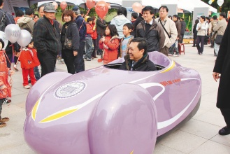 明道大學(xué)研發(fā)氫能燃料電池車在“國際燃料電池車觀摩會”上現(xiàn)身相當(dāng)顯眼,該校校長汪大永在廣場試乘時,引起矚目。圖片來源:聯(lián)合報