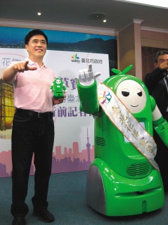 圖為臺(tái)北市長(zhǎng)郝龍斌日前為臺(tái)北花博機(jī)器人配戴彩帶,并賦予“香草寶貝”營(yíng)銷臺(tái)北的情形。圖片來源:臺(tái)灣《聯(lián)合晚報(bào)》