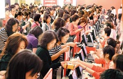 圖為臺中中港店內(nèi),消費者購物后再去兌換贈品人潮擁擠。圖片來源:臺灣中國時報