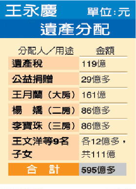 王永慶身后在臺灣留下595億元的遺產(chǎn),大房王月蘭原本可分到其中一半297億元。但根據(jù)王家人的協(xié)議,王月蘭將把分到的一半遺產(chǎn)均分給二房楊嬌和三房李寶珠,兩人各得74億多元;至于剩下的一半遺產(chǎn)在繳稅和捐贈后,由王永慶的三個妻子和九個子女均分,每人可得12億多元。