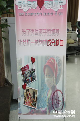 上海血液中心呼吁為患白血病兒童捐獻(xiàn)成分血的宣傳牌。(中國臺灣網(wǎng) 蕪?fù)?攝)