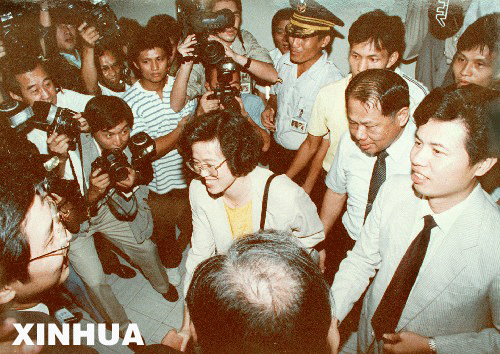1991年8月12日,新華社記者范麗青(女)作為大陸到臺(tái)灣采訪的第一批記者在臺(tái)北機(jī)場(chǎng)受到臺(tái)灣新聞界的歡迎和采訪。