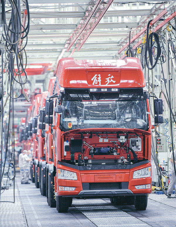 2020年8月10日,工人在位于吉林省長(zhǎng)春市的中國第一汽車集團(tuán)有限公司解放總裝車間裝配車輛。一汽2020年7月銷售整車32.2萬輛,同比增長(zhǎng)23.2%,延續(xù)了上半年的增長(zhǎng)態(tài)勢(shì)。 新華社記者 張楠/攝