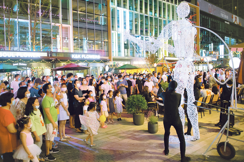 2020年8月8日,北京市朝陽區(qū)的“潮朝陽”消費(fèi)季活動(dòng)正式重啟。圖為8日當(dāng)晚,市民在望京小街商業(yè)街觀看巨型人偶表演。 新華社記者 陳鐘昊/攝